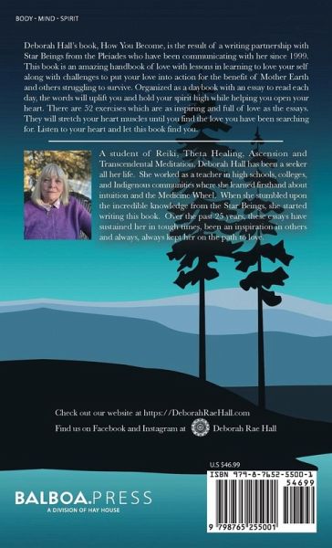 Deborah Hall's book, How You Become, is the result of a writing partnership with Star Beings from the Pleiades who have been communicating with her since 1999. This book is an amazing handbook of love with lessons in learning to love your self along with challenges to put your love into action for the benefit of Mother Earth and others struggling to survive. Organized as a daybook with an essay to read each day, the words will uplift you and hold your spirit high while helping you open your heart. There are 52 exercises which are as inspiring and full of love as the essays. They will stretch your heart muscles until you find the love you have been searching for. Listen to your heart and let this book find you.
