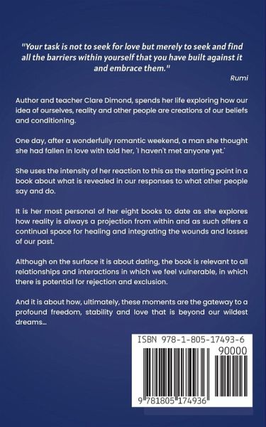 "Your task is not to seek for love but merely to seek and find all the barriers within yourself that you have built against it and embrace them." Rumi Author and teacher Clare Dimond, spends her life exploring how our idea of ourselves, reality and other people are creations of our beliefs and conditioning. One day, after a wonderfully romantic weekend, a man she thought she had fallen in love with told her, 'I haven't met anyone yet.' She uses the intensity of her reaction to this as the starting point in a book about what is revealed in our responses to what other people say and do. It is her most personal of her eight books to date as she explores how reality is always a projection from within and as such offers a continual space for healing and integrating the wounds and losses of our past. Although on the surface it is about dating, the book is relevant to all relationships and interactions in which we feel vulnerable, in which there is potential for rejection and exclusion. And it is about how, ultimately, these moments are the gateway to a profound freedom, stability and love that is beyond our wildest dreams...
