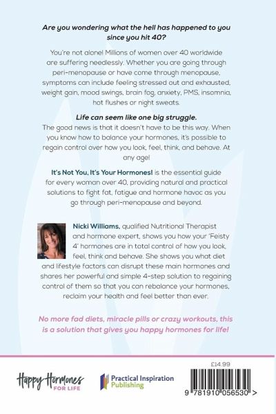 Nicki Williams, DipION, mBANT, CNHC, is a qualified Nutritional Therapist, speaker and founder of Happy Hormones for Life, helping women over 40 to get back to their absolute best - slimmer, energized, more productive and in full control of their hormones. After failing to find any medical help for her symptoms of exhaustion, weight gain and hormone issues in her early 40s, she discovered it was her hormones that were at fault and that she could turn things around using diet, lifestyle and natural supplements. She went on to qualify as a Nutritional Therapist at the renowned Institute of Optimum Nutrition (ION), making hormones her speciality. She now helps women all over the world with her online programmes, workshops and corporate, individual and group coaching. In her one-to-one work, she uses state-of-the-art comprehensive hormone (and other) testing and Functional Medicine principles to identify the root cause of any imbalance and provide fully personalized programmes for faster targeted results.
