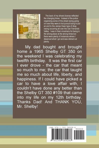 This is the true story of my dad's 1965 Shelby GT 350. He brought it home on my twelfth birthday and I was privileged to drive it for 40 to 50 thousand miles. I had gotten the car and myself into a lot of trouble as I was hot rodding all over the LA and Ventura landscape. I met Mr. Shelby at the Reno Air Races when he was with Barron Hilton. The first meeting I could not explain how much his car had meant to me so I went home and started writing. The initial letter he read and signed and took the rest of my manuscript to read later. Steve Fossett disappeared the following year preventing me from catching up to Mr. Shelby at the races and things happenned the next two years so now I will never know in his own words what he thought first hand. I get into some Moto Cross history and some of the Malibu jobs as well as the surfing that occurred back then. This is a fun read and I hope you enjoy!!!! CB