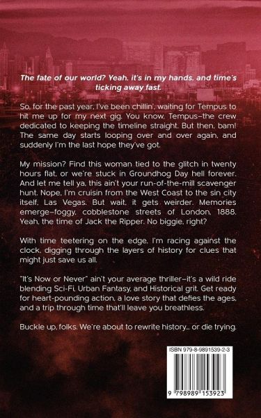 The fate of our world? Yeah, it's in my hands, and time's ticking away fast. So, for the past year, I've been chillin', waiting for Tempus to hit me up for my next gig. You know, Tempus-the crew dedicated to keeping the timeline straight. But then, bam! The same day starts looping over and over again, and suddenly I'm the last hope they've got. My mission? Find this woman tied to the glitch in twenty hours flat, or we're stuck in Groundhog Day hell forever. And let me tell ya, this ain't your run-of-the-mill scavenger hunt. Nope, I'm cruisin from the West Coast to the sin city itself, Las Vegas. But wait, it gets weirder. Memories emerge-foggy, cobblestone streets of London, 1888. Yeah, the time of Jack the Ripper. No biggie, right? With time teetering on the edge, I'm racing against the clock, digging through the layers of history for clues that might just save us all. "It's Now or Never" ain't your average thriller-it's a wild ride blending Sci-Fi, Urban Fantasy, and Historical grit. Get ready for heart-pounding action, a love story that defies the ages, and a trip through time that'll leave you breathless. Buckle up, folks. We're about to rewrite history... or die trying.