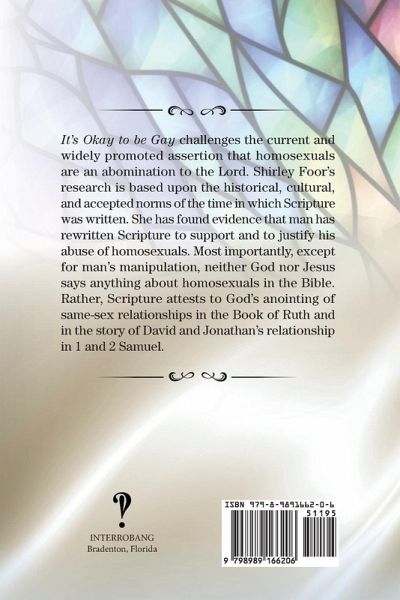 It's Okay to be Gay challenges the current and widely promoted assertion that homosexuals are an abomination to the Lord. Shirley Foor's research is based upon the historical, cultural, and accepted norms of the time in which Scripture was written. She has found evidence that man has rewritten Scripture to support and to justify his abuse of homosexuals. Most importantly, except for man's manipulation, neither God nor Jesus says anything about homosexuals in the Bible. Rather, Scripture attests to God's anointing of same-sex relationships in the Book of Ruth and in the story of David and Jonathan's relationship in 1 and 2 Samuel.