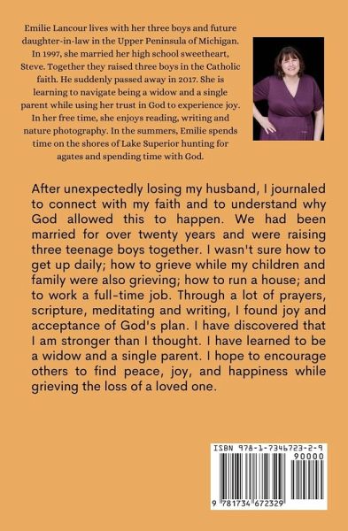 After unexpectedly losing my husband, I journaled to connect with my faith and to understand why God allowed this to happen. We had been married for over twenty years and were raising three teenage boys together. I wasn't sure how to get up daily; how to grieve while my children and family were also grieving; how to run a house; and to work a full-time job. Through a lot of prayers, scripture, meditating and writing, I found joy and acceptance of God's plan. I have discovered that I am stronger than I thought. I have learned to be a widow and a single parent. I hope to encourage others to find peace, joy, and happiness while grieving the loss of a loved one.