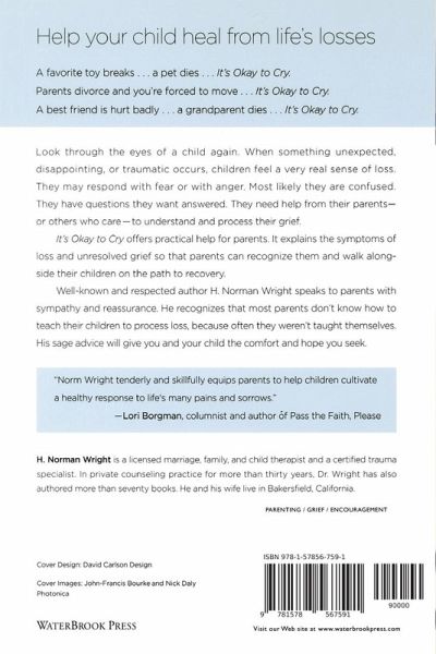 Help Your Child Heal From Life's Losses A favorite toy breaks . . . . A pet dies . . . It's Okay to Cry. Parents divorce and you're forced to move . . . It's Okay to Cry. A best friend is hurt badly . . . . A grandparent dies . . . It's Okay to Cry. Look through the eyes of a child again. When something unexpected, disappointing, or traumatic occurs, children feel a very real sense of loss. They may respond with fear or with anger. Most likely they are confused. They have questions they want answered. They need help from their parents or others who care to understand and process their grief. It's Okay to Cry offers practical help for parents. It explains the symptoms of loss and unresolved grief so that parents can recognize them and walk alongside their children on the path to recovery. Well-known and respected author H. Norman Wright speaks to parents with sympathy and reassurance. He recognizes that most parents don't know how to teach their children to process loss, because often they weren't taught themselves. His sage advice will give you and your child the comfort and hope you seek.