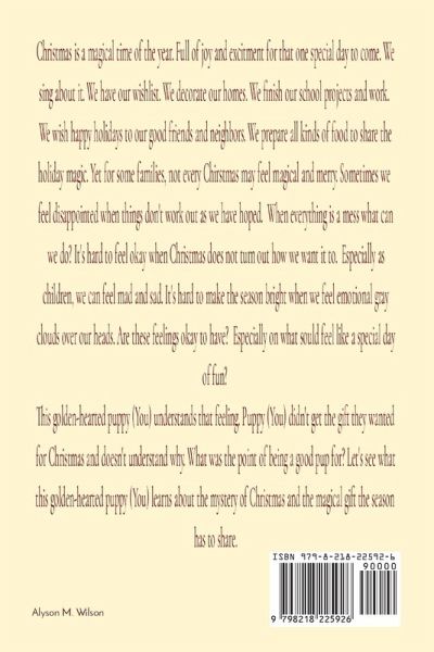Christmas is a magical time of year. Full of joy and excitement for that one special day to come. We sing about it. We have our wish list. We decorate our homes. We finish our school projects and work. We wish happy holidays to our good friends and neighbors. We prepare all kinds of food to share the holiday magic. Yet for some families, not every Christmas may feel magical and merry. Sometimes we feel disappointed when things don't work out as we have hoped. When everything is a mess what can we do? It's hard to feel okay when Christmas does not turn out how we want it to. Especially as children, we can feel mad and sad. It's hard to make the season bright when we feel emotional gray clouds over our head. Are these feelings okay to have? Especially, on what should feel like a special day of fun? This golden-hearted puppy (You) understands that feeling. Puppy (You) didn't get the gift they wanted for Christmas and doesn't understand why. What was that point of being a good pup for? Let's see what this golden-hearted puppy (You) learns about the mystery of Christmas and the magical gift the season has to share.