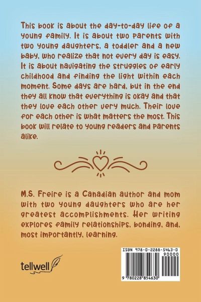 This book is about the day-to-day life of a young family. It is about two parents with two young daughters, a toddler and a new baby, who realize that not every day is easy. It is about navigating the struggles of early childhood and finding the light within each moment, and it touches upon emotional intelligence. Some days are hard, but in the end they all know that everything is okay and that they love each other very much. Their love for each other is what matters the most. This book will relate to young readers and parents alike.