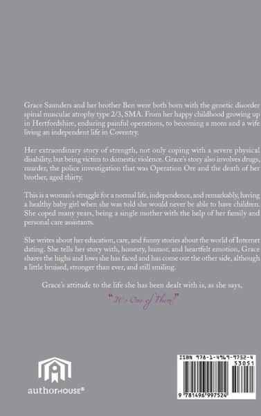 Grace Saunders and her brother Ben were both born with the genetic disorder spinal muscular atrophy type 2/3, SMA. From her happy childhood growing up in Hertfordshire, enduring painful operations, to becoming a mom and a wife living an independent life in Coventry. Her extraordinary story of strength, not only coping with a severe physical disability, but being victim to domestic violence. Grace's story also involves drugs, murder, the police investigation that was Operation Ore and the death of her brother, aged thirty. This is a woman's struggle for a normal life, independence, and remarkably, having a healthy baby girl when she was told she would never be able to have children. She coped many years, being a single mother with the help of her family and personal care assistants. She writes about her education, care, and funny stories about the world of Internet dating. She tells her story with, honesty, humor, and heartfelt emotion, Grace shares the highs and lows she has faced and has come out the other side, although a little bruised, stronger than ever, and still smiling. Grace's attitude to the life she has been dealt with is, as she says, "It's One of Them!"