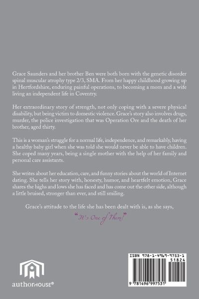 Grace Saunders and her brother Ben were both born with the genetic disorder spinal muscular atrophy type 2/3, SMA. From her happy childhood growing up in Hertfordshire, enduring painful operations, to becoming a mom and a wife living an independent life in Coventry. Her extraordinary story of strength, not only coping with a severe physical disability, but being victim to domestic violence. Grace's story also involves drugs, murder, the police investigation that was Operation Ore and the death of her brother, aged thirty. This is a woman's struggle for a normal life, independence, and remarkably, having a healthy baby girl when she was told she would never be able to have children. She coped many years, being a single mother with the help of her family and personal care assistants. She writes about her education, care, and funny stories about the world of Internet dating. She tells her story with, honesty, humor, and heartfelt emotion, Grace shares the highs and lows she has faced and has come out the other side, although a little bruised, stronger than ever, and still smiling. Grace's attitude to the life she has been dealt with is, as she says, "It's One of Them!"