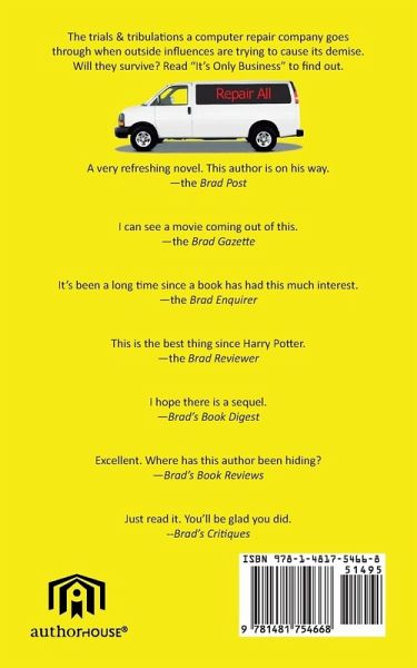 The trials & tribulations a computer repair company goes through when outside influences are trying to cause its demise. Will they survive? Read "It's Only Business" to find out. A very refreshing novel. This author is on his way. -the Brad Post I can see a movie coming out of this. -the Brad Gazette It's been a long time since a book has had this much interest. -the Brad Enquirer This is the best thing since Harry Potter. -the Brad Reviewer I hope there is a sequel. -Brad's Book Digest Excellent. Where has this author been hiding? -Brad's Book Reviews Just read it. You'll be glad you did. --Brad's Critiques