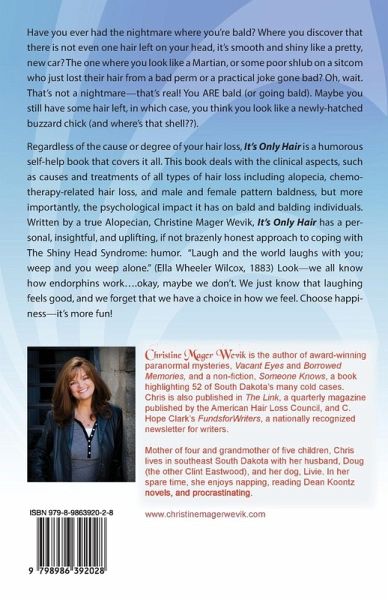 Have you ever had the nightmare where you're bald? Where. you discover that there is not even one hair left on your head, it's smooth and shiny like a pretty new car? The one where you look like a Martian, or some poor shrub on a sitcom who just lost their hair from a bad perm or a practical joke gone bad? Oh, wait. That's not a nightmare - that's real! You ARE bald (or going bald). Maybe you still have some hair left, in which case, you think you look like a newly-hatched buzzard chick (and where's that shell??). Regardless of the cause. or agree of your hair off, "It's Only Hair" is a humorous self-help book that covers it all.