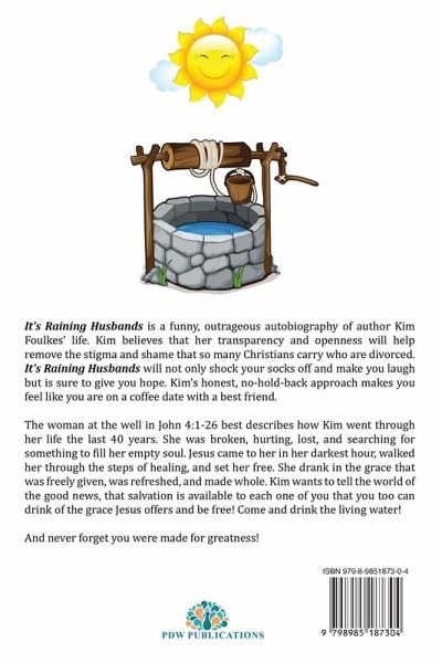 If you think you have seen or heard it all, you have not yet read It's Raining Husbands! This book was written by author Kim Foulkes concerning the last four decades of her life. Kim has courageously opened her life to the world so that others can benefit and learn from her mistakes and pain. She has overcome much adversity and yet continues to have a soft loving heart. Kim is a woman of great strength. She is a leader who is passionate about helping those who have suffered abuse. She desires to see them find freedom from the captivity of their past. The Bible story Kim relates most to is the Woman at the Well. It's about a woman who lived with many different men. She was searching and searching for something to fill the void that was deep within her. Something to make her forget her pain. Then one day, she had a chance encounter with Jesus who gave her living water of grace, washing away her sin and cleansing her soul. She was refreshed, made new, and finally whole. So many are in bondage to something. For Kim, it was men, marriages, and people-pleasing. For you, it might be some other addictive behavior that you are stuck in. We all have the same opportunity and chance to change our future! Doing the same thing over and over expecting a different result is the true definition of insanity. Come in and take a peek into Kim's story. It just might be what you need to start your path to freedom. If nothing else, Kim's many funny stories from her past are sure to keep you in stitches.