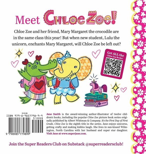 Chloe Zoe and Friends Advance to First Grade amid a Friendship Kerfuffle! Chloe Zoe is bigger and ready for new challenges in the eighth title in the popular picture book series! After a kindergarten year without her best friends, Mary Margaret the crocodile and George the giraffe, in her class, Chloe Zoe is excited to have been assigned the same first grade teacher as Mary Margaret. But when Mary Margaret is enchanted by new student, Lulu the unicorn, Chloe Zoe's fantasy of doing everything together bursts. Will Chloe Zoe be a third wheel in a huff? Or is there room to make a new friend? Perfect for beginning readers, the Chloe Zoe series highlights seasonal holidays and new experiences at home, in the classroom and out-and-about in the world. With a cozy trim size, bold, graphic illustrations and direct narration, Chloe Zoe meets little ones right where they are and invites them on a reading playdate that can continue on with activities and craft with author-illustrator, Jane Smith, at www.superjane.com.