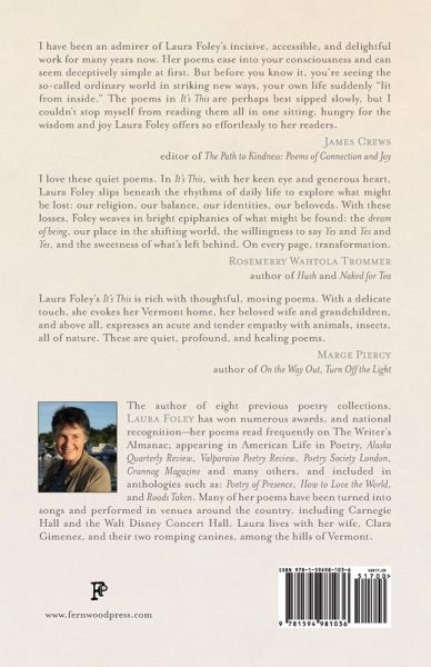 It's This contemplates relationships, identity, love, loss, and radical transformation, finding acceptance, joy, and growing peace, as the speaker practices meditation, and falls more deeply in love with her wife. Employing spare, musical language and humor, and suffused with light, these vivid poems flash back to the speaker's past, as they practice empathy and compassion in the present - for self and others, across political aisles, and species. Learning to accept mortality in losing loved ones and chaplaining hospice patients, she increasingly appreciates what presence has to teach, in the woods of nature and relationships: everything we seek is already in us, in each shining moment we allow ourselves to focus wholly on everything present, the hologram of this, which is the universe, "this field of snow, where I sit alone/on a hilltop, until I think of nothing, / but light - light on snow, light/prisming ice, light on light, on light."