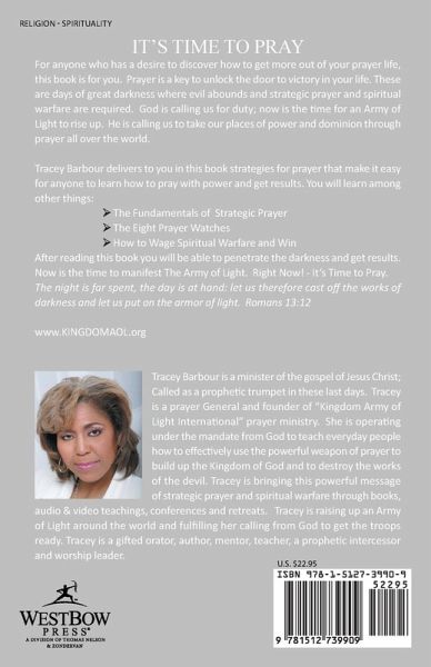 IT'S TIME TO PRAY For anyone who has a desire to discover how to get more out of your prayer life, this book is for you. Prayer is a key to unlock the door to victory in your life. These are days of great darkness where evil abounds and strategic prayer and spiritual warfare are required. God is calling us for duty; now is the time for an Army of Light to rise up. He is calling us to take our places of power and dominion through prayer all over the world. Tracey Barbour delivers to you in this book strategies for prayer that make it easy for anyone to learn how to pray with power and get results. You will learn among other things: The Fundamentals of Strategic Prayer The Eight Prayer Watches How to Wage Spiritual Warfare and Win After reading this book you will be able to penetrate the darkness and get results. Now is the time to manifest The Army of Light. Right Now! - It's Time to Pray. The night is far spent, the day is at hand: let us therefore cast off the works of darkness and let us put on the armor of light. Romans 13:12 www.KINGDOMAOL.org