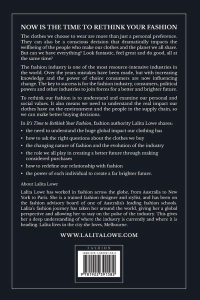 NOW IS THE TIME TO RETHINK YOUR FASHION The clothes we choose to wear are more than just a personal preference. They can also be a conscious decision that dramatically impacts the wellbeing of the people who make our clothes and the planet we all share. But can we have everything? Look fantastic, feel great and do good, all at the same time? The fashion industry is one of the most resource-intensive industries in the world. Over the years mistakes have been made, but with increasing knowledge and the power of choice consumers are now influencing change. The key to success is for the fashion industry, consumers, political powers and other industries to join forces for a better and brighter future. To rethink our fashion is to understand and examine our personal and social values. It also means we need to understand the real impact our clothes have on the environment and the people in the supply chain, so we can make better buying decisions. In It's Time to Rethink Your Fashion, fashion authority Lalita Lowe shares: · the need to understand the huge global impact our clothing has · how to ask the right questions about the clothes we buy · the changing nature of fashion and the evolution of the industry · the role we all play in creating a better future through making considered purchases · how to redefine our relationship with fashion · the power of each individual to create a far brighter future.