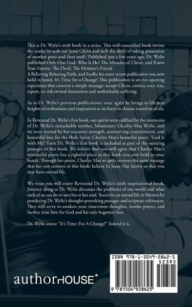 This is Dr. Wylie's sixth book in a series. This well-researched book invites the reader to seek out Jesus Christ and defy the devil of taking possession of another poor soul (lost soul). Published just a few years ago, Dr. Wylie published Only One God: Who Is He? The Miracles of Christ, and Know Your Enemy: The Devil, The Minister's Friend. A Believing Behaving Faith, and finally, his most recent publication you now hold in hand, It's Time for a Change! This publication is an eye-opening experience that conveys a simple message: accept Christ, confess your sins, repent, or risk eternal damnation and unthinkable suffering. As in Dr. Wylie's previous publications, once again he brings to life new heights of enthusiasm and inspiration as we learn to cleanse ourselves of sin. In Reverend Dr. Wylie's first book, our spirits were uplifted by the memories of Dr. Wylie's remarkable mother, Missionary Charlye Mae Wylie, and we were moved by her uncanny strength, unswerving commitment, and bountiful love for the Holy Spirit. Charlye Mae's beautiful poem "God Is with Me" from Dr. Wylie's first book is included as part of the opening passages of this book. We believe that you will agree that Charlye Mae's wonderful poem has a rightful place in this book you now hold in your hands. Through her poem, Charlye Mae so aptly conveys the same message that her son conveys in this book: believe In Jesus Our Savior so that you may have eternal life. We trust you will enjoy Reverend Dr. Wylie's sixth inspirational book. Journey along as Dr. Wylie discusses the problems of our world and what each of us can do to save his or her soul. Yearn for an eternal life in Heaven by pondering Dr. Wylie's thought-provoking passages and scripture references. They will serve to awaken your innermost thoughts, invoke prayer, and further your love for God and his only begotten Son. Dr. Wylie states: "It's Time: For A Change!" Indeed it is.