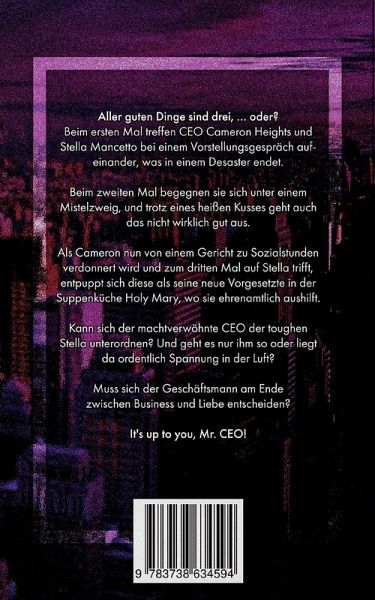 Er ist arrogant ...Er ist ein Macho ...Aber leider genau mein Typ ...Aller guten Dinge sind drei, ... oder?Beim ersten Mal treffen CEO Cameron Heights und Stella Mancetto bei einem Vorstellungsgespräch aufeinander, was in einem Desaster endet.Beim zweiten Mal begegnen sie sich unter einem Mistelzweig, und trotz eines heißen Kusses geht auch das nicht wirklich gut aus.Als Cameron nun von einem Gericht zu Sozialstunden verdonnert wird und zum dritten Mal auf Stella trifft, entpuppt sich diese als seine neue Vorgesetzte in der Suppenküche Holy Mary, wo sie ehrenamtlich aushilft.Kann sich der machtverwöhnte CEO der toughen Stella unterordnen? Und geht es nur ihm so oder liegt da ordentlich Spannung in der Luft?Muss sich der Geschäftsmann am Ende zwischen Business und Liebe entscheiden?It's up to you, Mr. CEO!