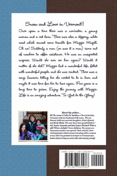 Maggie Magill is a spirited young woman who loves life and is content. She sees wonder in everything around her, and she is very grateful. Life has not been easy, but she is an optimistic person, always ready for an adventure. A lovely red barn, a nor'easter snowstorm, and a slippery road in Vermont's countryside cause trouble for Maggie. As she sits and ponders about what to do, an unexpected surprise startles her. Oh no! What is that? Or rather, who is that? Maggie knows that life is filled with surprises. She had not expected to lose the love of her life in a war five years ago, but she did. She had not expected to find joy again, but she did, in her work with toddlers and preschool children. God is good. Maggie does not expect to fall in love again, but a new journey for her is beginning on that snowy road in Vermont. It is a journey of discovery, one that will fill her heart with a new kind of happiness and a new kind of love. To God be the glory.