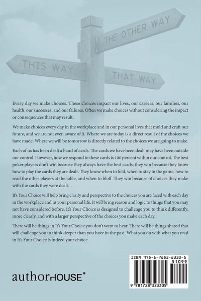 Every day we make choices. These choices impact our lives, our careers, our families, our health, our successes, and our failures. Often we make choices without considering the impact or consequences that may result. We make choices every day in the workplace and in our personal lives that mold and craft our future, and we are not even aware of it. Where we are today is a direct result of the choices we have made. Where we will be tomorrow is directly related to the choices we are going to make. Each of us has been dealt a hand of cards. The cards we have been dealt may have been outside our control. However, how we respond to these cards is 100 percent within our control. The best poker players don't win because they always have the best cards; they win because they know how to play the cards they are dealt. They know when to fold, when to stay in the game, how to read the other players at the table, and when to bluff. They win because of choices they make with the cards they were dealt. It's Your Choice will help bring clarity and perspective to the choices you are faced with each day in the workplace and in your personal life. It will bring reason and logic to things that you may not have considered before. It's Your Choice is designed to challenge you to think differently, more clearly, and with a larger perspective of the choices you make each day. There will be things in It's Your Choice you don't want to hear. There will be things shared that will challenge you to think deeper than you have in the past. What you do with what you read in It's Your Choice is indeed your choice.