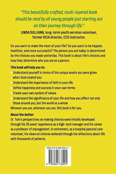 Do you want to make the most of your life? Do you want to be happier, healthier, and more successful? The person you are today is determined by the choices you made yesterday. This book is about the choices that determine who you are as a person and the life you live. >Linda Sullivan, long-term youth services volunteer, former director of adult religious training and youth faith formation instructor. This book will help you to: * Make better decisions and choices in your life * Use your dreams to find happiness * Improve your relationships with friends and family * Use values to become the best person you can be * Find and use the unique assets you were given when God created you * Define happiness and success in your own terms * Understand the importance of faith in your life * Understand the significance of your life and how you affect not only those around you, but the world as a whole In It's Your Choice, the author relies heavily on use of personal examples and heartfelt stories to illustrate concepts that can be used to shape the reader's life. Rather than offering prescriptions, Dr. Tom lays out issues for consideration and encourages the readers to make their own choices as to what is important to them and how they want live their life. Consistent with the author's writing, it's your life and It's Your Choice. Whoever you are, wherever you are, this book is for you. Get started now on the road to the life you deserve.