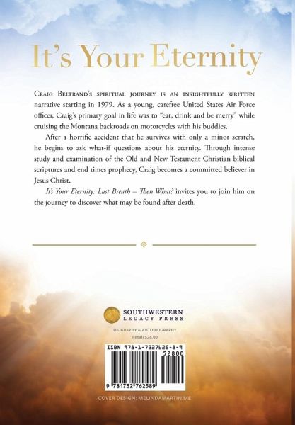 Craig Beltrand's spiritual journey is an insightfully written narrative starting in 1979. As a young, carefree United States Air Force officer, Craig's primary goal in life was to "eat, drink and be merry" while cruising the Montana backroads on motorcycles with his buddies. After a horrific accident that he survives with only a minor scratch, he begins to ask what-if questions about his eternity. Through intense study and examination of the Old and New Testament Christian biblical scriptures and end times prophecy, Craig becomes a committed believer in Jesus Christ. It's Your Eternity: Last Breath - Then What? invites you to join him on the journey to discover what may be found after death.