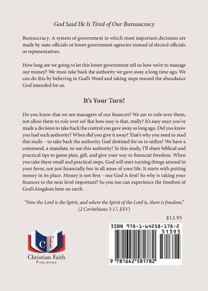 God Said He Is Tired of Our Bureaucracy Bureaucracy: A system of government in which most important decisions are made by state officials or lower government agencies instead of elected officials or representatives. How long are we going to let this lower government tell us how we're to manage our money? We must take back the authority we gave away a long time ago. We can do this by believing in God's Word and taking steps toward the abundance God intended for us. It's Your Turn! Do you know that we are managers of our finances? We are to rule over them, not allow them to rule over us! But how easy is that, really? It's easy once you've made a decision to take back the control you gave away so long ago. Did you know you had such authority? When did you give it away? That's why you need to read this study-to take back the authority God destined for us to utilize! We have a command, a mandate, to use this authority! In this study, I'll share biblical and practical tips to game plan, gift, and give your way to financial freedom. When you take these small and practical steps, God will start turning things around in your favor, not just financially but in all areas of your life. It starts with putting money in its place. Money is not first-our God is first! So why is taking your finances to the next level important? So you too can experience the freedom of God's kingdom here on earth. "Now the Lord is the Spirit, and where the Spirit of the Lord is, there is freedom." (2 Corinthians 3:17, ESV)