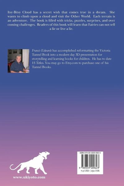 Itsy-Bitsy Cloud has a secret wish that comes true in a dream. She wants to climb upon a cloud and visit the Other World. Each terrain is an adventure. The book is filled with tricks, puzzles, surprises, and over coming challenges. Readers of this book will learn that Fairies can not tell a lie or live a lie.