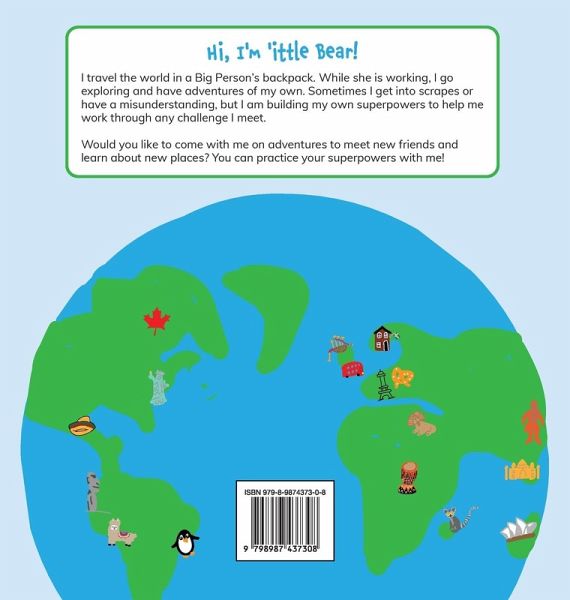'ittle Bear travels the world in a Big Person's suitcase. While the Big Person works, she goes out on adventures of her own. As she travels, she experiences the wonderful things that one does when traveling (new places, exciting sights, new food, and new friends). She also experiences a challenge that she solves through three superpowers that she has the potential for and develops within herself. These superpowers enable her to interact effectively across cultures, religions, and communities and are based on research in organizational psychology and intercultural collaboration. This is the first book that will be followed with specific country, region, and activity books. Each subsequent book will introduce a new friend who is her guide, as well as highlights of that location, such as language, sights, food, and customs. She will experience a specific challenge with each book where she will have a chance to exercise and strengthen her superpowers. The books give children a chance to travel and experience our world without leaving their bedroom or classroom. Through the books, we hope to introduce a love of experiencing all the exciting differences in our world, as well build the ability to interact effectively in a global society.