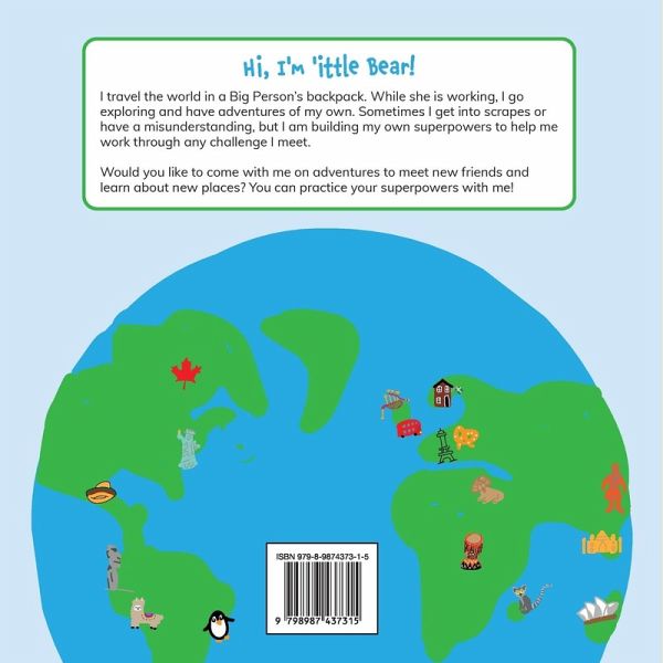 'ittle Bear travels the world in a Big Person's suitcase. While the Big Person works, she goes out on adventures of her own. As she travels, she experiences the wonderful things that one does when traveling (new places, exciting sights, new food, and new friends). She also experiences a challenge that she solves through three superpowers that she has the potential for and develops within herself. These superpowers enable her to interact effectively across cultures, religions, and communities and are based on research in organizational psychology and intercultural collaboration. This is the first book that will be followed with specific country, region, and activity books. Each subsequent book will introduce a new friend who is her guide, as well as highlights of that location, such as language, sights, food, and customs. She will experience a specific challenge with each book where she will have a chance to exercise and strengthen her superpowers. The books give children a chance to travel and experience our world without leaving their bedroom or classroom. Through the books, we hope to introduce a love of experiencing all the exciting differences in our world, as well build the ability to interact effectively in a global society.