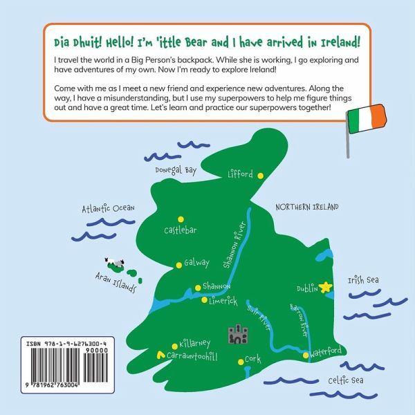 'ittle Bear travels the world in a Big Person's suitcase. While the Big Person works, she goes out on adventures of her own. As she travels, she experiences the wonderful things that one does when traveling (new places, exciting sights, new food, and new friends). Now she has arrived in Ireland! She meets her new friend, Siobhan Sheep, and experiences a challenge that she solves through three superpowers that she has the potential for and develops within herself. These superpowers enable her to interact effectively across cultures, religions, and communities and are based on research in organizational psychology and intercultural collaboration. Come with her while she explores and learns about Ireland and its culture, language, and food. See what she encounters and learns with her new friend, Siobhan!