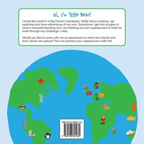 'ittle Bear travels the world in a Big Person's suitcase. While the Big Person works, she goes out on adventures of her own. As she travels, she experiences the wonderful things that one does when traveling (new places, exciting sights, new food, and new friends). She also experiences a challenge that she solves through three superpowers that she has the potential for and develops within herself. These superpowers enable her to interact effectively across cultures, religions, and communities and are based on research in organizational psychology and intercultural collaboration. This is the first book that will be followed with specific country, region, and activity books. Each subsequent book will introduce a new friend who is her guide, as well as highlights of that location, such as language, sights, food, and customs. She will experience a specific challenge with each book where she will have a chance to exercise and strengthen her superpowers. The books give children a chance to travel and experience our world without leaving their bedroom or classroom. Through the books, we hope to introduce a love of experiencing all the exciting differences in our world, as well build the ability to interact effectively in a global society.