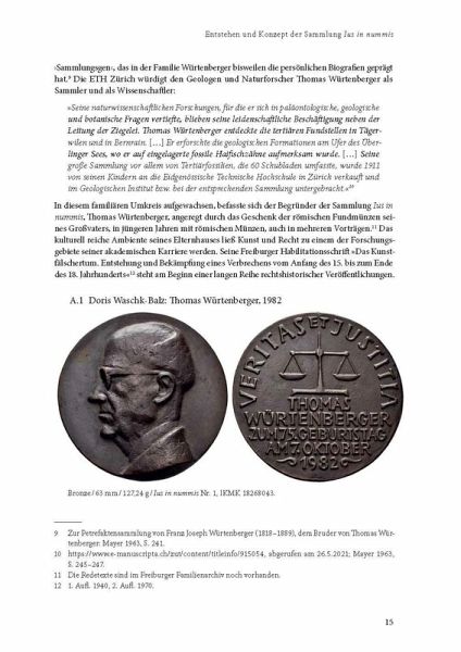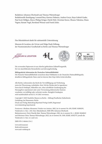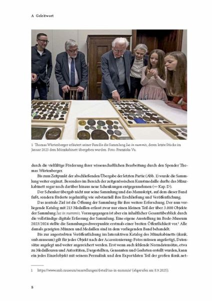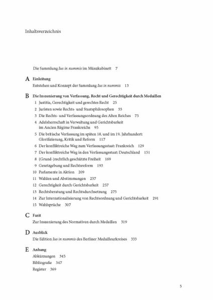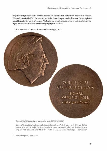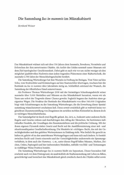 Im Januar 2023 wurde dem Münzkabinett der Staatlichen Museen zu Berlin (Preußischer Kulturbesitz) die Sammlung "Ius in nummis" des Freiburger Rechtswissenschaftlers Professor Dr. Thomas Würtenberger als Schenkung überlassen. Sie umfasst mit über 3000 Medaillen das größte zusammenhängende Corpus mit Bezügen zu Recht, Gerechtigkeit sowie Parlaments- und Verfassungsgeschichte. Der Sammlungsfokus auf Westeuropa in zunehmend globaler Perspektive erlaubt vielfältige Einblicke in die Geschichte medialer Inszenierungen von Rechtskultur.Der Katalog stellt die Fragestellung der Sammlung vor. Er präsentiert und kontextualisiert über 400 Schlüsselstücke mit Konzentration auf Rechtskulturen der atlantischen Welt und fragt nach Perspektiven einer weiterführenden Auswertung der Medaillen als rechtshistorische Quellen.