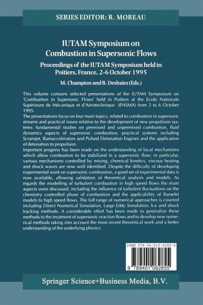 The IUTAM Symposium on "Combustion in Supersonic Flows" was held in Poitiers at Ecole Nationale Superieure de Mecanique et d'Aerotechnique (ENSMA) from 2 to 6 october 1995. The Symposium was hosted by the Laboratoire de Combustion et de Detonique (UPR - CNRS 9028) and was attended by 60 delegates from 10 countries. The formal presentations and invited lectures were focused on four main topics, related to combustion in supersonic streams and practical issues relative to the development of new propulsion system: fundamental studies on premixed and unpremixed combustion, fluid dynamic aspects of supersonic combustion, practical system including Scramjet, Ramaccelerators and Pulsed Detonation Engines, application of detonation to propulsion. Invited lectures presenting the state of the art on these topics as well as available data base were delivered by professors Paul A. Libby from University of California at San Diego, Vladimir Sabel'nikov from TsAGI (Russia), Paul Clavin from IRPHE (Marseille, France) and Drs Shmuel Eidelman from SAlC (USA), Gunter Smeets from the French-German Institut of Saint-Louis and Bruno Deshaies from LCD (poi tiers, France).