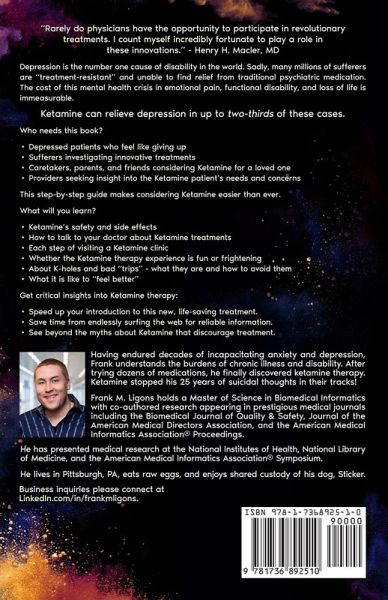 Depression is the #1 cause of disability worldwide. Sadly, many millions of sufferers are "treatment-resistant" and unable to find relief from traditional psychiatric medication. The cost of this mental health crisis in emotional pain, functional disability, and loss of life is immeasurable. IV Ketamine Infusions break through treatment-resistant depression in 2 out of 3 cases. This step-by-step guide makes considering Ketamine easier than ever. Who needs this book?Depressed patients who feel like giving up Sufferers investigating innovative treatments Caretakers, parents, and friends researching Ketamine for a loved one Providers seeking insight into the needs and concerns of patients What will you learn?Ketamine's safety and side effects How to talk to your doctor about Ketamine Each step of visiting a Ketamine clinic The Ketamine therapy experience - fun or frightening? About K-holes and "bad trips" - what they are and how to avoid them Get critical insights into Ketamine therapy.Speed up your introduction to this new, life-saving treatment. Save time from endlessly surfing the web for reliable information. Debunk the myths that discourage potential patients. A medical researcher and Ketamine patient answers your key questions.Is it safe? How does it feel? Where can I find treatment? What does it cost? Does insurance cover it? Includes a foreword full of hope from Dr. Henry Macler, whose clinic performs thousands of procedures, and an entire section referencing dozens of clinical studies. Don't suffer needlessly. Buy now to learn about this life-saving treatment.