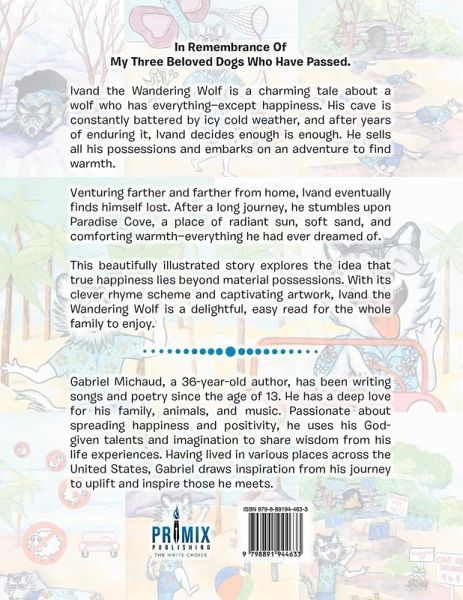 In Remembrance Of My Three Beloved Dogs Who Have Passed. Ivand the Wandering Wolf is a charming tale about a wolf who has everything-except happiness. His cave is constantly battered by icy cold weather, and after years of enduring it, Ivand decides enough is enough. He sells all his possessions and embarks on an adventure to find warmth.Venturing farther and farther from home, Ivand eventually fi nds himself lost. After a long journey, he stumbles upon Paradise Cove, a place of radiant sun, soft sand, and comforting warmth-everything he had ever dreamed of.This beautifully illustrated story explores the idea that true happiness lies beyond material possessions. With its clever rhyme scheme and captivating artwork, Ivand the Wandering Wolf is a delightful, easy read for the whole family to enjoy.