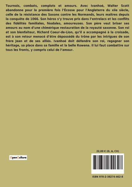 Tournois, combats, complots et amours. Avec Ivanhoé, Walter Scott abandonne pour la première fois l¿Écosse pour l¿Angleterre du xiie siècle, celle de la résistance des Saxons contre les Normands, leurs maîtres depuis la conquête de 1066. Son héros s¿y trouve pris dans l¿entrelacs et les conflits des fidélités familiales, féodales, amoureuses. Son père veut briser ses amours au nom d¿une chimérique restauration de la royauté saxonne. Son roi et son bienfaiteur, Richard Coeur-de-Lion, qüil a accompagné à la croisade, est à son retour menacé d¿être dépossédé du trône par les intrigues de son frère Jean et de ses alliés. Ivanhoé doit défendre son roi, regagner son héritage, sa place dans sa famille et la belle Rowena. Il lui faut combattre sur tous les fronts, y compris celui de l¿amour.