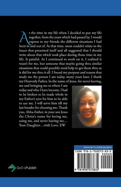 At the time in my life when I decided to put my life together, from the years which had passed by, I would express to my friends the different situations I had been in and out of. At that time, most couldn't relate to the issues that presented itself and all suggested that I should write about that which took place during those time in my life. It painful. As I continued to work on it, I realized it wasn't for me, but someone that maybe going thru similar situations that could possibly need help to get them thru as it did for me thru it all. I found my purpose and reason that made me the person I am today, many years later. I thank my Heavenly Father, In the name of Jesus, for never leaving, me and bringing me to where I am today and who I have become. I had to be broken to be made whole in my Father's eyes for him to be able to use me. I will serve him till my last breathe for choosing me. Thank you, Abba-Father, in your son Jesus the Christ's name for loving me, using me, and never leaving me... Your Daughter...with Love. EW