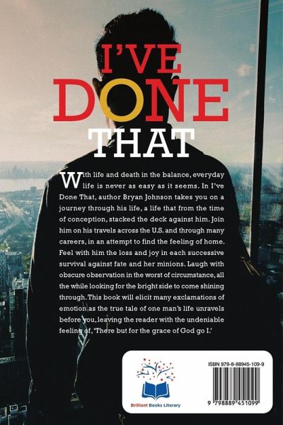 With life and death in the balance, everyday life is never as easy as it seems. In I've Done That, author Bryan Johnson takes you on a journey through his life, a life that from the time of conception, stacked the deck against him. Join him on his travels across the U.S. and through many careers, in an attempt to find the feeling of home. Feel with him the loss and joy in each successive survival against fate and her minions. Laugh with obscure observation in the worst of circumstance, all the while looking for the bright side to come shining through. This book will elicit many exclamations of emotion as the true tale of one man's life unravels before you, leaving the reader with the undeniable feeling of, 'There but for the grace of God go I.'