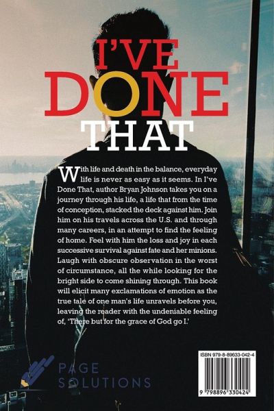 With life and death in the balance, everyday life is never as easy as it seems. In I've Done That, author Bryan Johnson takes you on a journey through his life, a life that from the time of conception, stacked the deck against him. Join him on his travels across the U.S. and through many careers, in an attempt to find the feeling of home. Feel with him the loss and joy in each successive survival against fate and her minions. Laugh with obscure observation in the worst of circumstance, all the while looking for the bright side to come shining through. This book will elicit many exclamations of emotion as the true tale of one man's life unravels before you, leaving the reader with the undeniable feeling of, 'There but for the grace of God go I.'