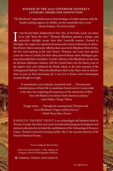 It was the day before Independence Day, 1833. As his bride, Lucie, was about to be sold down the river, Thornton Blackburn planned a daring-and successful-daylight escape from their Louisville masters. Pursued to Michigan, the couple was captured and sentenced to return to Kentucky in chains. But Detroit's black community rallied to their cause in the Blackburn Riots of 1833, the first racial uprising in the city's history. Thornton and Lucie were spirited across the river to Canada, but their safety proved illusory when Michigan's governor demanded their extradition. Canada's defense of the Blackburns set the tone for all future diplomatic relations with the United States over the thorny issue of the fugitive slave, and confirmed the British colony as the main terminus of the Underground Railroad. The Blackburns settled in Toronto, where they founded the city's first taxi business, but they never forgot the millions who still suffered in slavery. Working with prominent abolitionists, Thornton and Lucie made their home a haven for runaways. When they died in the 1890s with no descendants to pass on their fascinating tale, it was lost to history. Lost, that is, until archaeologists brought the story of Thornton and Lucie Blackburn again to light.