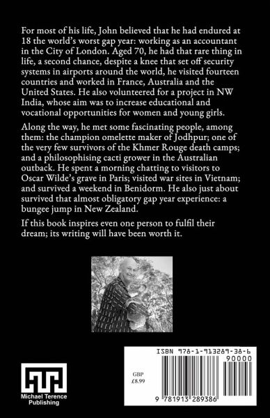 For most of his life, John believed that he had endured at 18 the world's worst gap year: working as an accountant in the City of London. Aged 70, he had that rare thing in life, a second chance, despite a knee that set off security systems in airports around the world, he visited fourteen countries and worked in France, Australia and the United States. He also volunteered for a project in NW India, whose aim was to increase educational and vocational opportunities for women and young girls. Along the way, he met some fascinating people, among them: the champion omelette maker of Jodhpur; one of the very few survivors of the Khmer Rouge death camps; and a philosophising cacti grower in the Australian outback. He spent a morning chatting to visitors to Oscar Wilde's grave in Paris; visited war sites in Vietnam; and survived a weekend in Benidorm. He also just about survived that almost obligatory gap year experience: a bungee jump in New Zealand. If this book inspires even one person to fulfil their dream; its writing will have been worth it. John Kirkaldy was born in July 1947 in Srinagar, Kashmir, a few days before Indian Independence. His father was a British Army officer, trying to assist in one of the biggest human migrations in history. John's father was Anglo Scots, his mother Norwegian and he has two half Irish children. His upbringing to teenage years was typical of service life with stays in Manchester, Burma, Germany, County Durham, Hampshire and Wiltshire. He was educated at Tonbridge and the LSE, and the Universities of the West Indies and New South Wales. John taught at universities, colleges and schools in Britain, Jamaica and Australia. He was a tutor with the Open University (OU) for 37 years and contributed to a school textbook and three Irish history academic anthologies. He was also part of the production team for four OU TV history series. John is a regular book reviewer, mainly for Books Ireland, and a freelance writer for a wide range of publications, stretching from The Lady to the New Statesman.