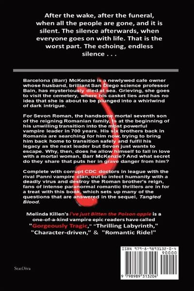 After the wake, after the funeral, when all the people are gone, and it is silent. The silence afterwards, when everyone goes on with life. That is the worst part. The echoing, endless silence . . . A feisty woman is determined to rebuild her life and put the mysterious loss of her husband behind her -until her new love interest reveals a shocking secret they share that puts her in grave danger, especially from him. Barcelona (Barr) McKenzie is a newlywed cafe owner whose husband, brilliant San Diego science professor Bain, has mysteriously died at sea. Grieving, she goes to visit the cemetery, where his casket lies and has no idea that she is about to be plunged into a whirlwind of dark intrigue. For Sevon Roman, the handsome mortal seventh son of the reigning Romanian family, is at the beginning of his unwilling transition into the most powerful vampire leader in 700 years. His six brothers back in Romania are searching for him now, trying to bring him back home to transition safely and fulfil his legacy as the next leader but Sevon just wants to escape. Why, then, does he allow himself to fall in love with a mortal woman, Barr McKenzie? And what secret do they share that puts her in grave danger from him? Complete with corrupt CDC doctors in league with the rival Panni vampire clan, out to infect humanity with a deadly virus and destroy the Roman brother's reign, fans of intense paranormal romantic thrillers are in for a treat with this book, which sets up many of the questions that are answered in the sequel, Tangled Blood. Melinda Killen's i've just Bitten the Poison apple is a one-of-a-kind vampire epic readers have called "Gorgeously Tragic," "Thrilling Labyrinth," "Character-driven," and "Romantic Ride!".