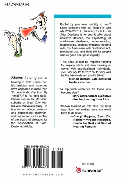 Baffled by your new inability to hear? Know someone who is? Then I've Lost My WHAT???: A Practical Guide to Life After Deafness is for you. It talks about assistive devices, the psychology of adult-onset deafness, communication, relationships, cochlear implants, hearing aids, the Americans with Disabilities Act, telephone use, and daily life for people who've gone deaf post-lingually. "This book should be required reading for anyone who's lost their hearing or works with late-deafened individuals. I've Lost My WHAT??? could very well be the late-deafened adult's Bible."--Michele Bornert, Late-deafened freelance writer "A top-notch reference for those who become deaf."--Mary Clark, former executive director, Hearing Loss Link "Shawn learned all this stuff the hard way. Now he's making sure you won't have to do it too."--Cheryl Heppner, Exec. Dir. Northern Virginia Resource, Center for Deaf and Hard of Hearing Persons