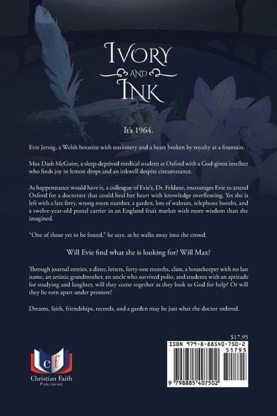 It's 1964. Evie Jernig, a Welsh botanist with stationery and a heart broken by royalty at a fountain. Max Dash McGuire, a sleep-deprived medical student at Oxford with a God-given intellect who finds joy in lemon drops and an inkwell despite circumstance. As happenstance would have it, a colleague of Evie's, Dr. Feldane, encourages Evie to attend Oxford for a doctorate that could heal her heart with knowledge overflowing. Yet she is left with a late ferry, wrong room number, a garden, lots of walnuts, telephone booths, and a twelve-year-old postal carrier in an England fruit market with more wisdom than she imagined. "One of those yet to be found," he says, as he walks away into the crowd. Will Evie find what she is looking for? Will Max? Through journal entries, a diner, letters, forty-one months, class, a housekeeper with no last name, an artistic grandmother, an uncle who survived polio, and students with an aptitude for studying and laughter, will they come together as they look to God for help? Or will they be torn apart under pressure? Dreams, faith, friendships, records, and a garden may be just what the doctor ordered.