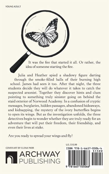It was the fire that started it all. Or rather, the idea of someone starting the fire. Julia and Heather spied a shadowy figure darting through the smoke-filled halls of their burning high school. James had seen it too. After that night, the three students decide they will do whatever it takes to catch the suspected arsonist. Together they discover hints and clues pointing to something truly sinister going on behind the staid exterior of Norwood Academy. In a confusion of cryptic messages, burglaries, hidden passages, abandoned hideaways, and kidnapping, the mystery of the ivory butterflies begins to open its wings. But as the investigation unfolds, the three detectives begin to wonder whether they are truly ready for an adventure that will put their freedom, their friendship, and even their lives at stake. Are you ready to spread your wings and fly?