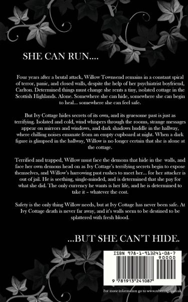 SHE CAN RUN... Four years after a brutal attack, Willow Townsend remains in a constant spiral of terror, panic, and closed walls, despite the help of her psychiatrist boyfriend, Carlton. Determined things must change she rents a tiny, isolated cottage in the Scottish Highlands. Alone. Somewhere she can hide, somewhere she can begin to heal... somewhere she can feel safe. But Ivy Cottage hides secrets of its own, and its gruesome past is just as terrifying. Isolated and cold; wind whispers through the rooms, strange messages appear on mirrors and windows, and dark shadows huddle in the hallway where chilling noises emerge from the empty cupboard. When a dark figure is glimpsed in the hallway, Willow begins to doubt her sanity. Terrified and trapped, Willow must face the demons that hide in the walls, and face her own demons head on, as Ivy Cottage's terrifying secrets begin to expose themselves, and Willow's harrowing past rushes to meet her... for her attacker is out of jail. He is seething, single-minded, and is determined that she pay for what she did. The only currency he wants is her life, and he is determined to take it - whatever the cost. Safety is the only thing Willow needs, but Ivy Cottage has never been safe. Death is never far away, and it's walls seem to be destined to be splattered with fresh blood. ...BUT SHE CAN'T HIDE