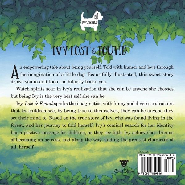 An empowering tale about being yourself, told with humor and love through the imagination of a little dog. This beautifully illustrated story draws you in and then the hilarity hooks you. Ivy Lost & Found sparks the imagination with funny and diverse characters. Children see that by being true to themselves they can be whoever they want to be. Based on the true story of Ivy who was found living in the forest. Ivy's identity search has a positive message for children as they watch little Ivy achieve her dreams of becoming an actor and along the way finding the greatest character of all, herself. Pick up the Ivy Coloring Book and Ivy Activity Book to create a special experience for a child when they can color along with the story.