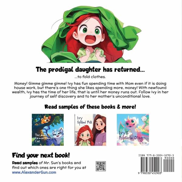 Who needs to work when they're richer than a queen? Ivy loved helping Mom, especially when she got her allowance. But after finding money on the ground, Ivy doesn't need to help do work with Mom. While Ivy has the time of her life, Mom is left at home by herself doing all the housework herself alone. In this retelling of one of the most well known parables, children and adults alike can learn from the story and discuss lessons from it.