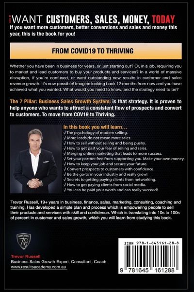 If you want to move from COV19 to thriving, reading iWANT Customers Sales Money Today will leave you inspired and upskilled with the proven scripts, tools and methods, and mindset. So you have the confidence and clarity for how to innovate and stand out from the competition and learn the simple secrets to have a consistent flow of happy buying customers and achieve your desire for sales growth and profits. If you want more sales and buying customers. Study sales and how to have buying customers. Marketing brings them to the door, sales bring's them through the door. Do you know how to bring them through the door? As I was told by an accountant, I trained to sell with skill who made over $360,000 from one client conversion, said he came out from the meeting and high fived himself he was so happy with this result. Why didn't he learn these skills sooner? Read the book, keep what you want, leave with you don't. A good skill that is important to you worked on, is better than the perfect skill, never worked on. I have trained many 100s of business owners, leaders, and teams who have achieved 10s to 100s of % increases in conversion and sales revenue growth by applying these methods and approaches to modern, authentic business development sales and money management. If it will work for them it will work for you. All you have to do is get stuck into and open your mind to some ways of doing business and your career a bit differently, or in ways you new but just need a refresher and reminder. I believe in you, you can do be and have all you desire. Let's help you to go get more of what you want. Success to you, Trevor Russell