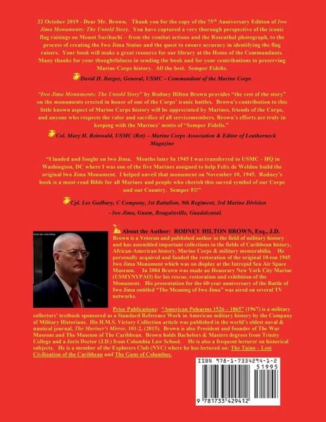 ATTENTION! "I landed and fought on lwo Jima. I saw with my own eyes our flag go up on Mount Suribachi……Rodney's book is a must-read Bible for all Marines and people who cherish this sacred symbol of our Corps and our Country. Semper Fi!" [Iwo Jima Survivor Cpl. Les Gadbury] Published just in time for the 75th Anniversary of IWO JIMA, this book - with FOREWORD by General Michael W. Hagee, USMC, 33rd Commandant of the United States Marine Corps - is the first comprehensive study of all of our nation’s Iwo Jima Monuments, beginning with the little-known original 1945 Monument, the 1954 Marine Corps War Memorial, those erected at Marine Corps bases and many lesser-known others from coast-to-coast! Iwo Jima’s bloody legacy includes more casualties than D-Day/Normandy. One third of all Marines who died in World War II were killed on Iwo Jima. One third of all Marines who fought on Iwo Jima were killed or wounded on Iwo Jima. As the biographer of Iwo Jima sculptor Felix de Weldon, Brown acquired de Weldon’s entire World War II and 1950s archive of thousands of photographs, documents, correspondence and primary source material never before seen. At 300+ pages and with hundreds of photos and illustrations, this is a definitive work filling a void in Marine Corps history.